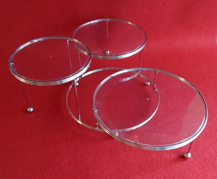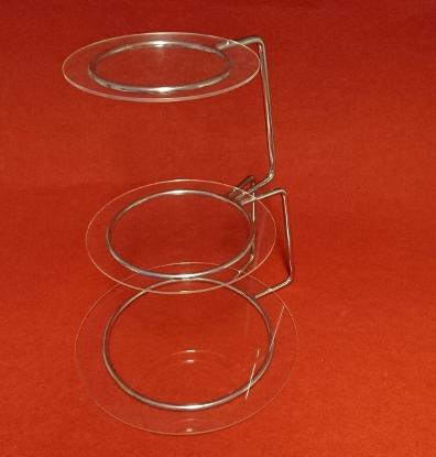 Beskrivning: Tårtställning i rostfri metall med löstagbara tårtplattor i genomskinlig akrylpast.