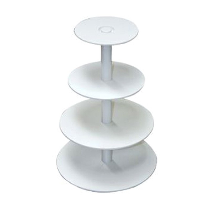 Beskrivning: Tårtställning i vit plast för flera tårtor, våningstårtor eller cupcakes på flera våningsplan. Antalet våningar kan anpassas genom att ta bort våningsplan.