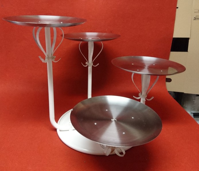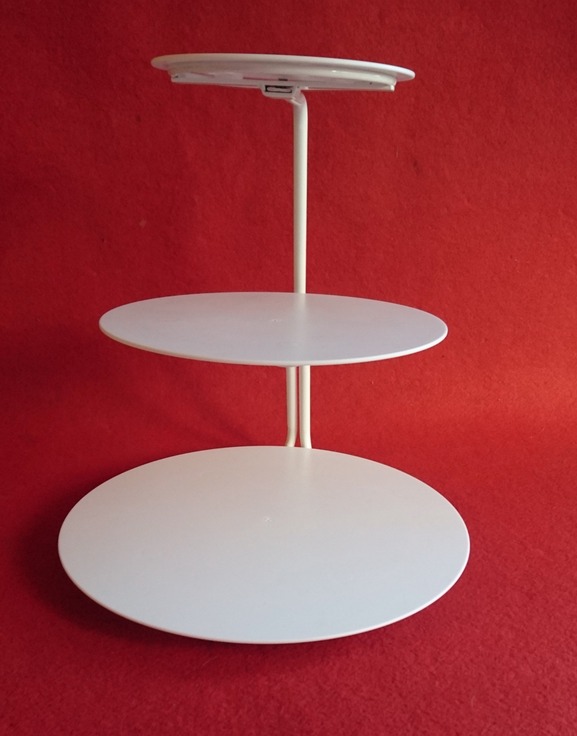 Beskrivning: Tårtställning i vitmålad metall till våningståror eller för uppläggning av t.ex. cupcakes på flera våningsplan.