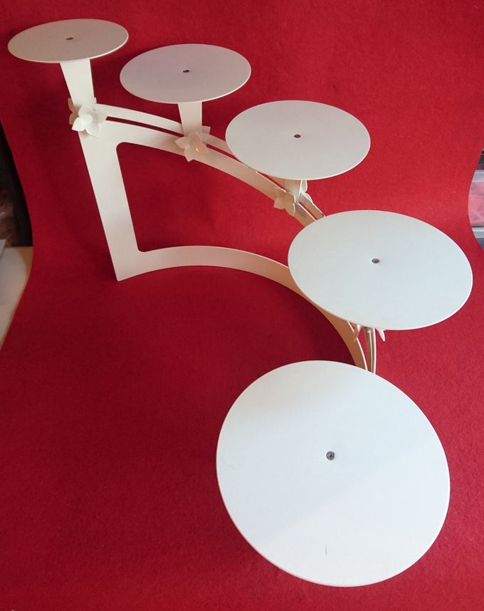 Beskrivning: Tårtställning vit metalltrappa för valfritt antal tårtor (max 5) och reglerbar placering av tårtor, dekorerad design.
